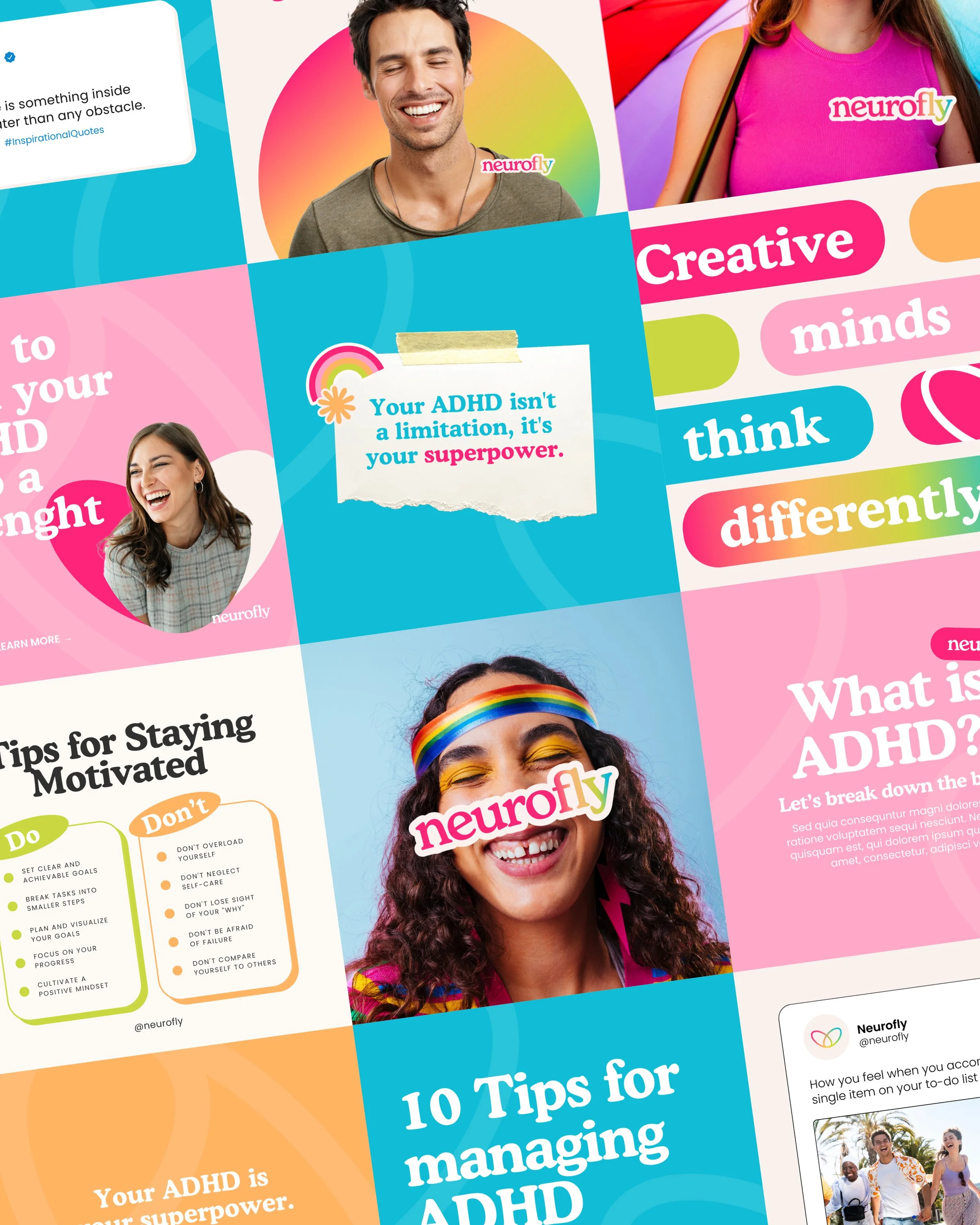 The challenge for this UK-based ADHD community and supplement brand was to create a clear, inclusive, and supportive visual identity for a neurodivergent audience. The goal was to design a system that feels open, positive, and easy to recognise, while reflecting the diversity of neurodivergence. The visual language needed to balance clarity with strong emotional impact, making the brand feel both trustworthy and empowering.